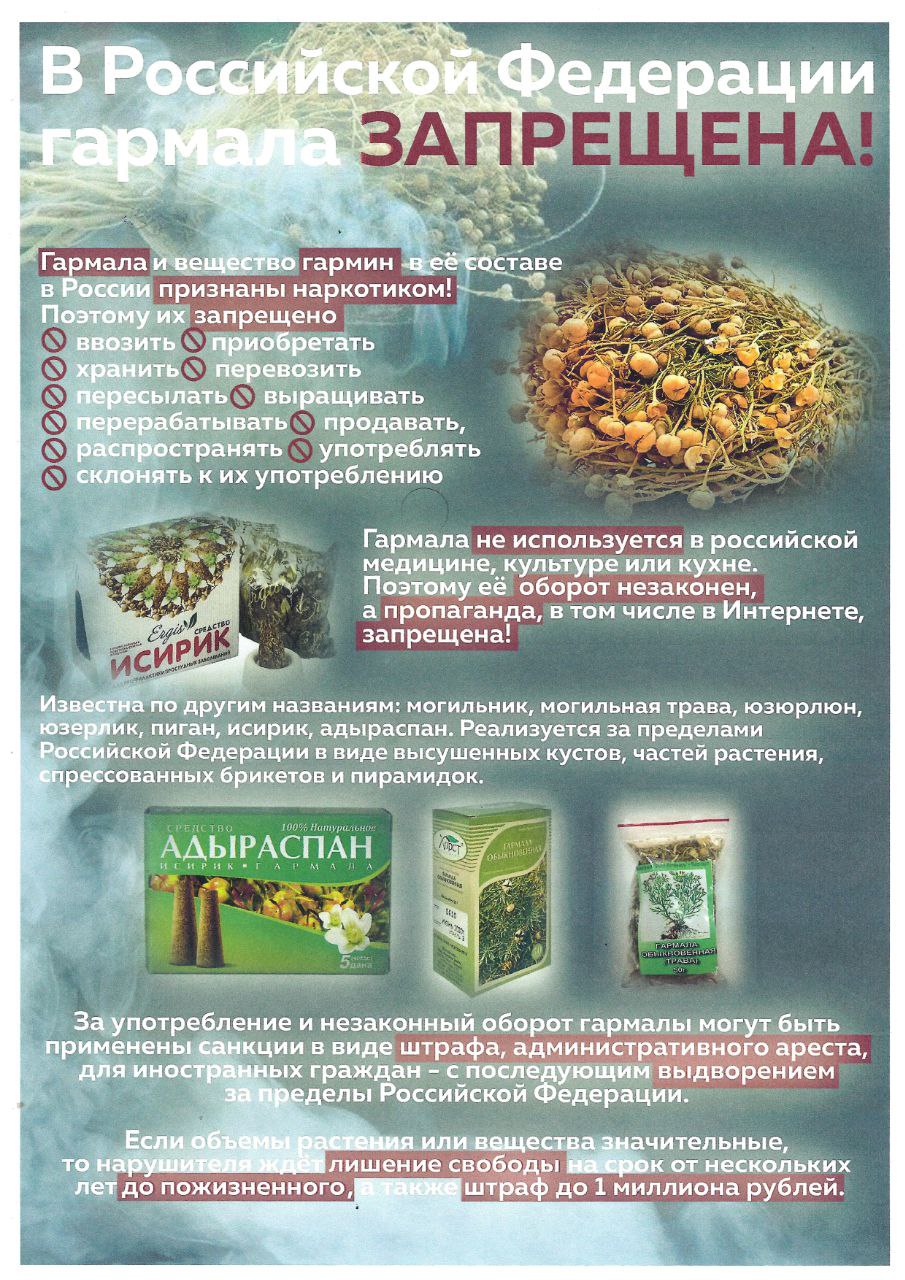 Посольство Российской Федерации в Республике Южная Осетия со ссылкой на памятку МВД России информирует о запрете оборота и ввоза в Российскую Федерацию наркосодержащего растения гармала (адыраспан) и вещества гармин в его составе. Незаконны выращивание, ввоз, оборот, употребление растения и вещества гармин; пропаганда веществ, в том числе в Интернете, запрещена.