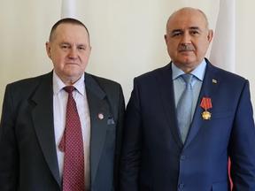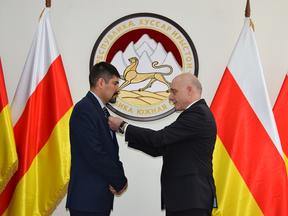 Почетный полярник СССР В.С. Кошелев по поручению Председателя ЦК КПРФ Г.А Зюганова вручил Министру иностранных дел Республики Южная Осетия Д.Н. Медоеву юбилейную медаль «100 лет Октябрьской Революции».