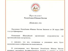 Ранее 20 марта Парламент Республики Южная Осетия ратифицировал Закон Республики Южная Осетия «О присоединении Республики Южная Осетия к Конвенции Шанхайской организации по противодействию экстремизму».