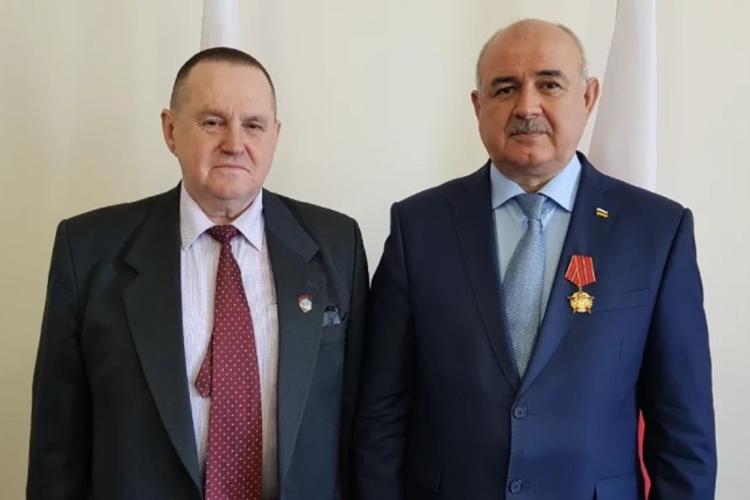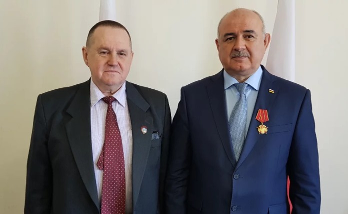 Почетный полярник СССР В.С. Кошелев по поручению Председателя ЦК КПРФ Г.А Зюганова вручил Министру иностранных дел Республики Южная Осетия Д.Н. Медоеву юбилейную медаль «100 лет Октябрьской Революции».