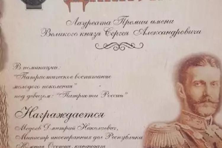 В ходе торжественной церемонии Дмитрий Медоев был награжден Дипломом и статуэткой лауреата Премии ИППО имени Великого князя Сергея Александровича в номинации «Патриотическое воспитание подрастающего поколения» под девизом «Патриоты России».