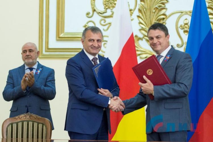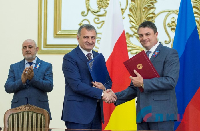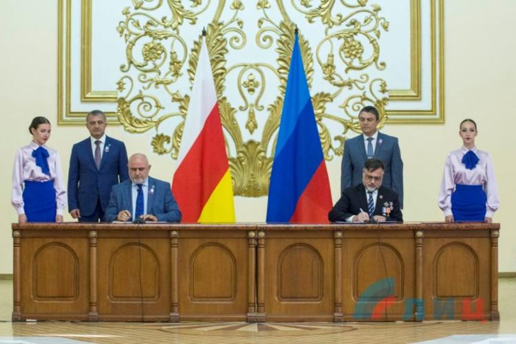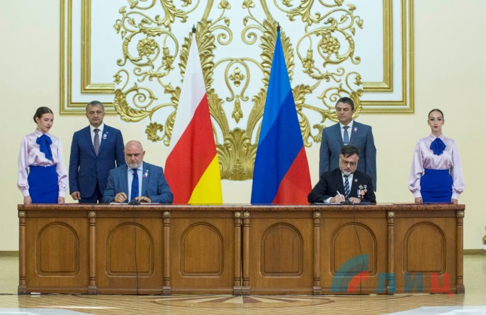 В присутствии Анатолия Бибилова и Леонида Пасечника Министр иностранных дел Республики Южная Осетия Дмитрий Медоев и Министр иностранных дел Луганской Народной Республики Владислав Дейнего подписали Соглашение об установлении дипломатических отношений между Республикой Южная Осетия и Луганской Народной Республикой.