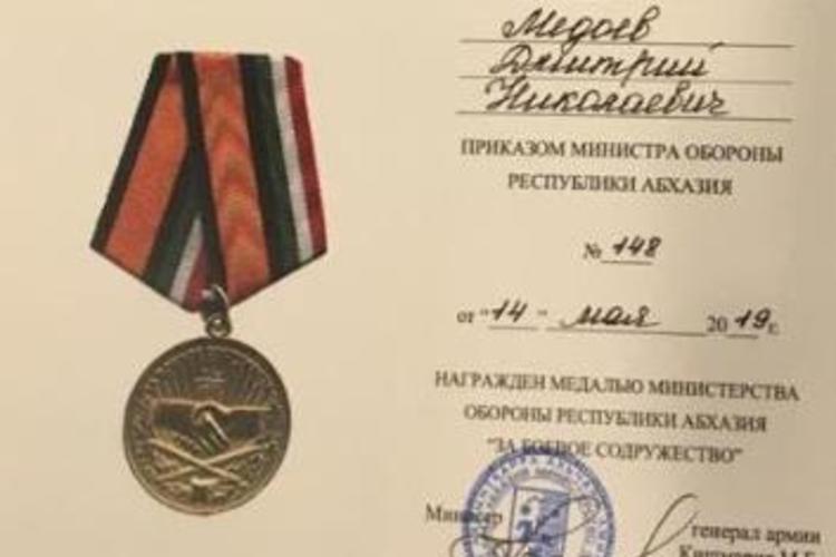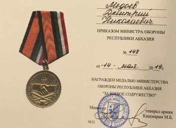 Приказом по Министерству обороны Республики Абхазия №148 от 14 мая 2019 года за заслуги в укреплении дружественных связей между Республикой Абхазия и Республикой Южная Осетия Министр иностранных дел Республики Южная Осетия Д.Н. Медоев награжден медалью Министерства обороны Республики Абхазия «За боевое содружество».