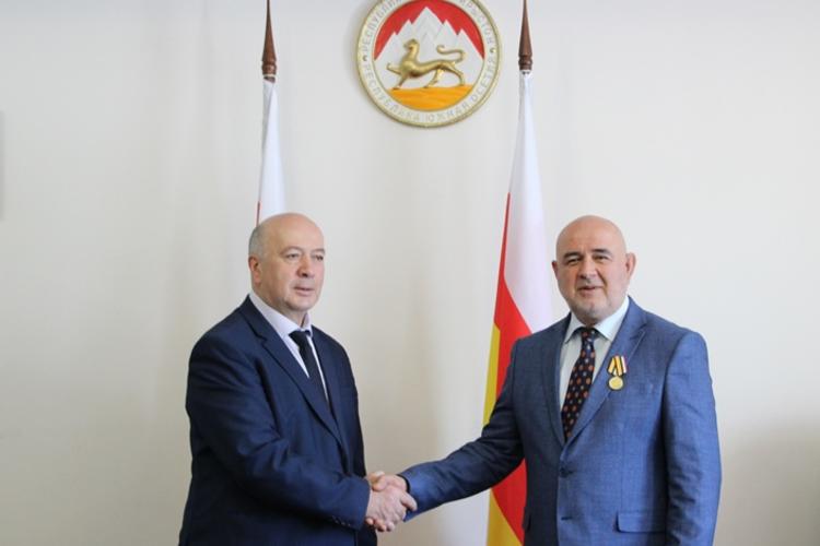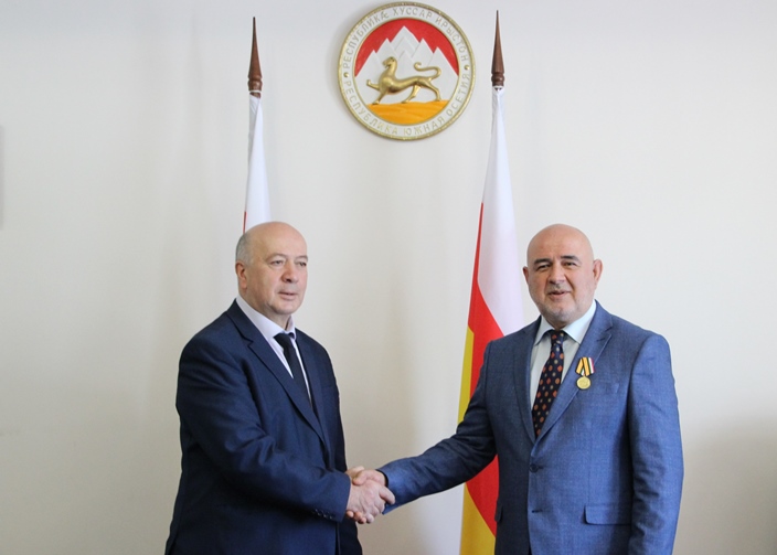 Алан Елбакиев, выполняя поручение Правительства Республики Абхазия, вручил Дмитрию Медоеву медаль Министерства обороны Республики Абхазия «За боевое содружество», которой он был награжден ранее Приказом по Министерству обороны Республики Абхазия за заслуги в укреплении дружественных связей между Республикой Абхазия и Республикой Южная Осетия.