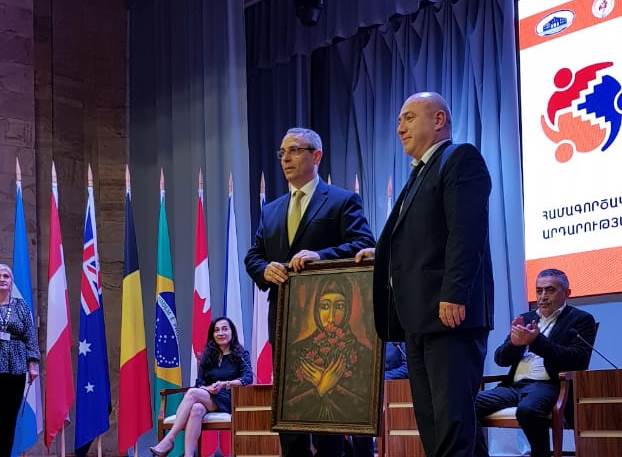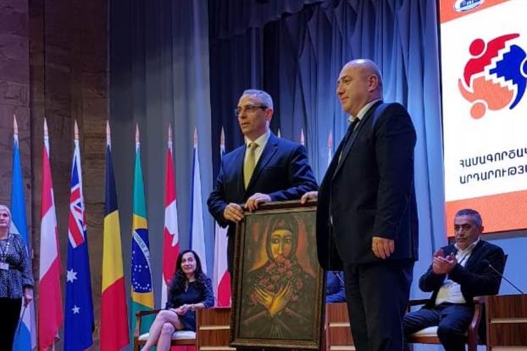Мкртчян, приветствуя участников Форума, отметила важность проведения подобных мероприятий для укрепления связей между Арцахом и его друзьями, а также преподнесла в подарок картину цхинвальского художника Валерия Авагимова «Карабахская Мадонна».