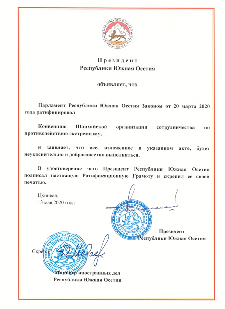 13 мая Президент Республики Южная Осетия А.И. Бибилов подписал Ратификационную грамоту, подтверждающую проведение Югоосетинской Стороной внутригосударственных процедур по присоединению Республики Южная Осетия к Конвенции Шанхайской организации сотрудничества по противодействию экстремизму.