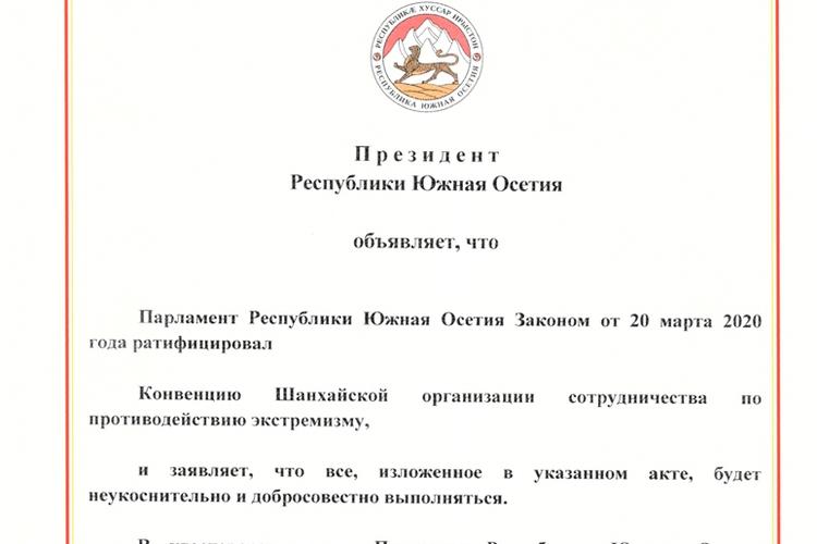 Ранее 20 марта Парламент Республики Южная Осетия ратифицировал Закон Республики Южная Осетия «О присоединении Республики Южная Осетия к Конвенции Шанхайской организации по противодействию экстремизму».