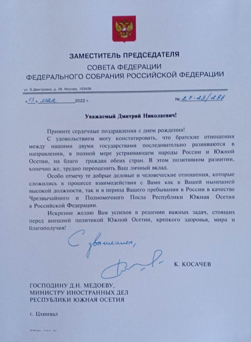 Поздравительное послание Заместителя Председателя Совета Федерации Федерального собрания Российской Федерации К.И. Косачева Министру иностранных дел Республики Южная Осетия Д.Н. Медоеву по случаю Дня рождения