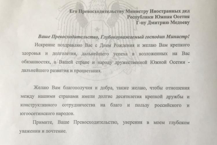 Поздравительное послание Чрезвычайного и Полномочного Посла Сирийской Арабской Республики в Российской Федерации г-на Риада Хаддада Министру иностранных дел Республики Южная Осетия Дмитрию Медоеву по случаю Дня рождения