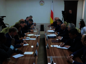 Для торжественной встречи Д.В. Пушилина перед зданием администрации Президента Южной Осетии был выстроен почетный караул, подняты государственные флаги Республики Южная Осетия и Донецкой Народной Республики, исполнены гимны двух стран.